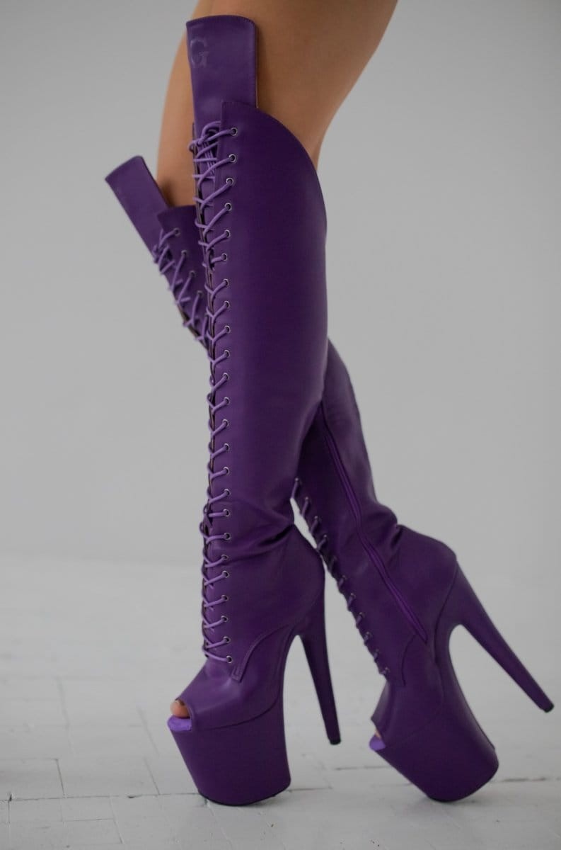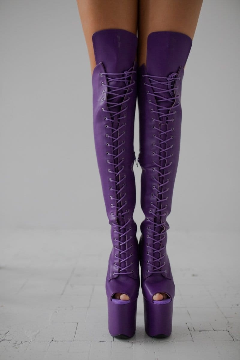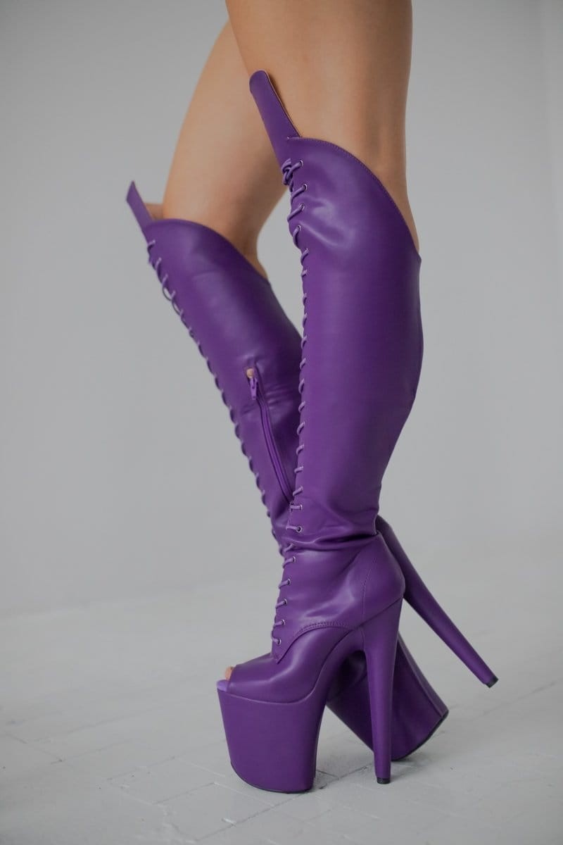 Kozaki za kolano wykonane z fioletowej matowej eco skóry.