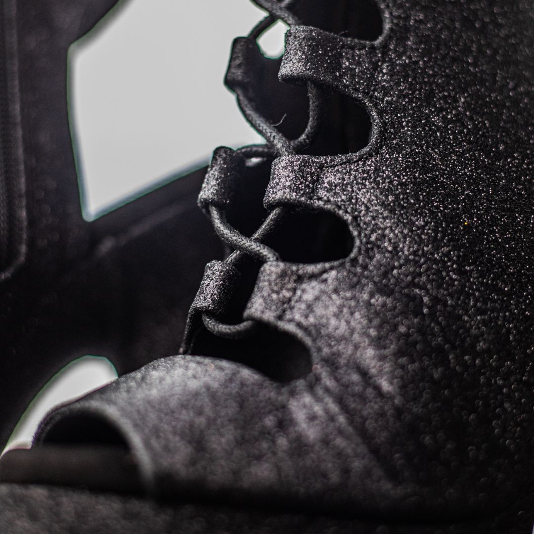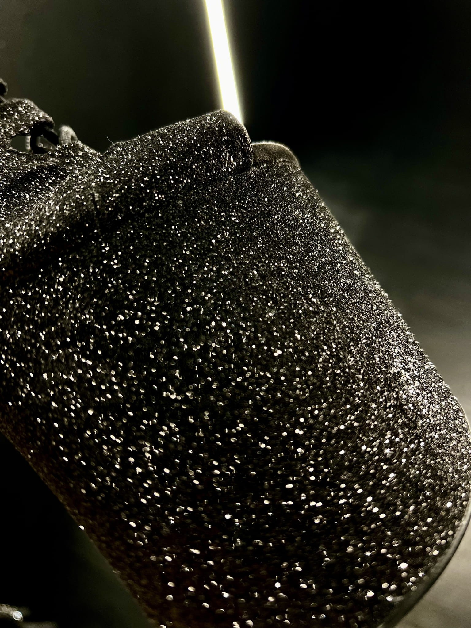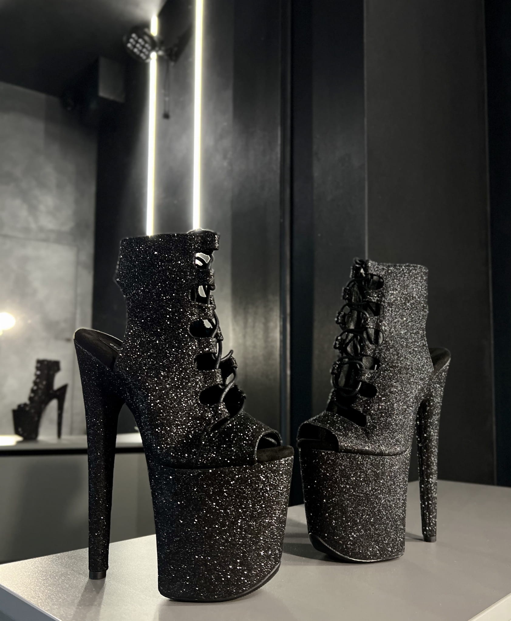 Sandałki do exotic pole dance wykonane z czarnej brokatowej eco skóry (wegańskiej).